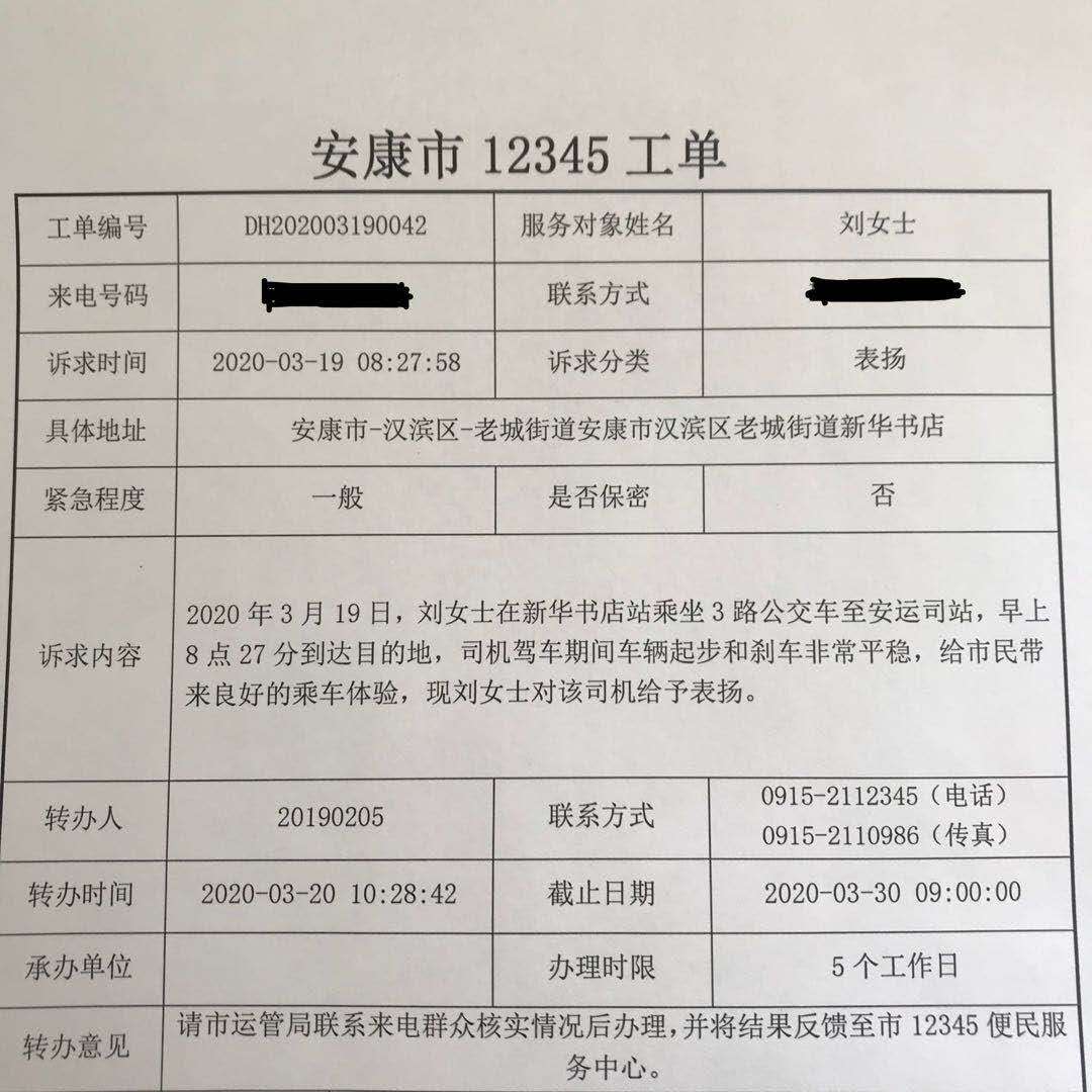 3路公交途經(jīng)地區(qū)路況復(fù)雜,客流量大,但駕駛員喻祥根師傅在當(dāng)班期間,用自己嫻熟的技術(shù)和優(yōu)質(zhì)的服務(wù)為乘客帶去了愉快的乘車體驗(yàn)。為此乘客劉女士特通過(guò)12345服務(wù)平臺(tái)表達(dá)自己的敬意。