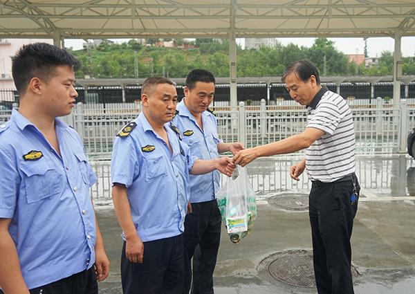 在火車站調(diào)度室,張曉強(qiáng)一行檢查當(dāng)日帶班領(lǐng)導(dǎo)、值班人員在崗在位情況,了解值班值守落實(shí)制度、工作安排和落實(shí)等情況。為駕駛員送去了毛巾、菊花茶、花露水、風(fēng)油精等降溫物品,與他們一起拉家常,詳細(xì)詢問(wèn)身體情況、工作和生活現(xiàn)狀,認(rèn)真傾聽(tīng)面臨的困難訴求和對(duì)當(dāng)前工作的意見(jiàn)建議,叮囑他們做好夏季防暑降溫、安全運(yùn)營(yíng)工作。