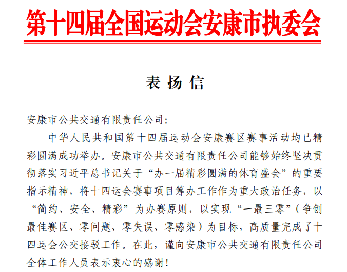 近日,第十四屆全國運(yùn)動(dòng)會(huì)安康市執(zhí)委會(huì)向市公交公司發(fā)來表揚(yáng)信,對(duì)公交公司高質(zhì)量完成十四運(yùn)會(huì)公交接駁工作表示感謝。
